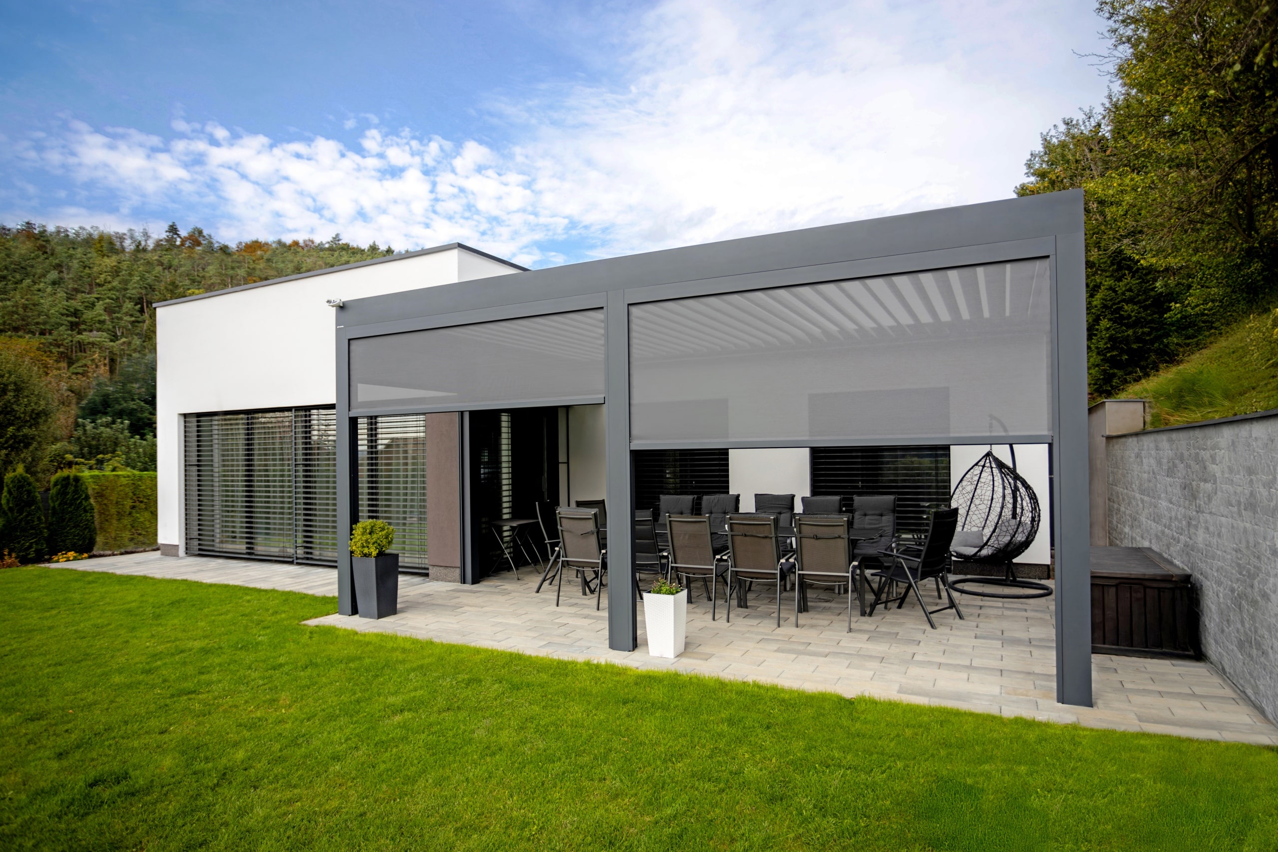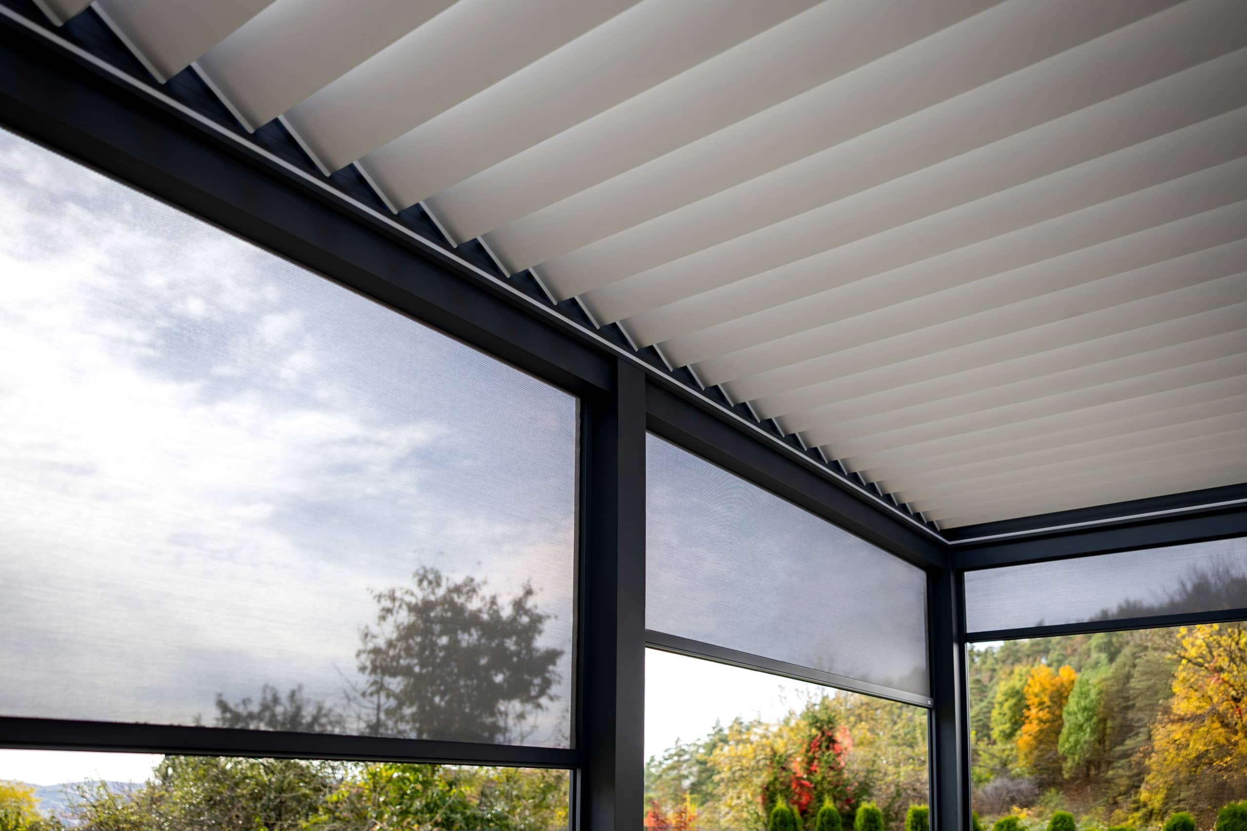 Detail bioklimatické samostatně stojící pergoly LAMARK | Opočno | Boční stínění - pevné stínění z hliníku a screenová roleta | Šedá antracitová barva | Dešťové čidlo | Větrné čidlo | Ovládání
