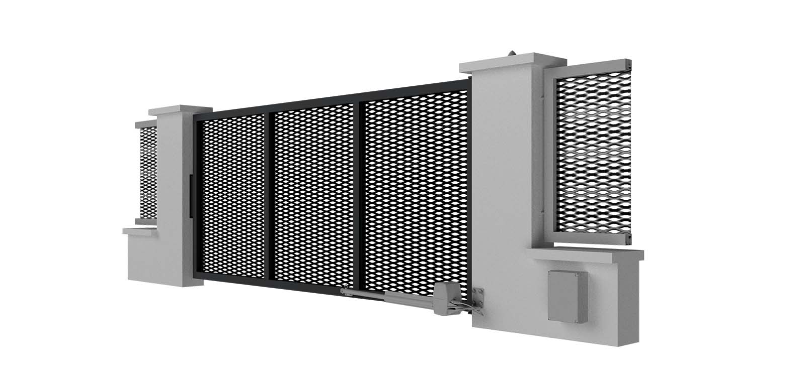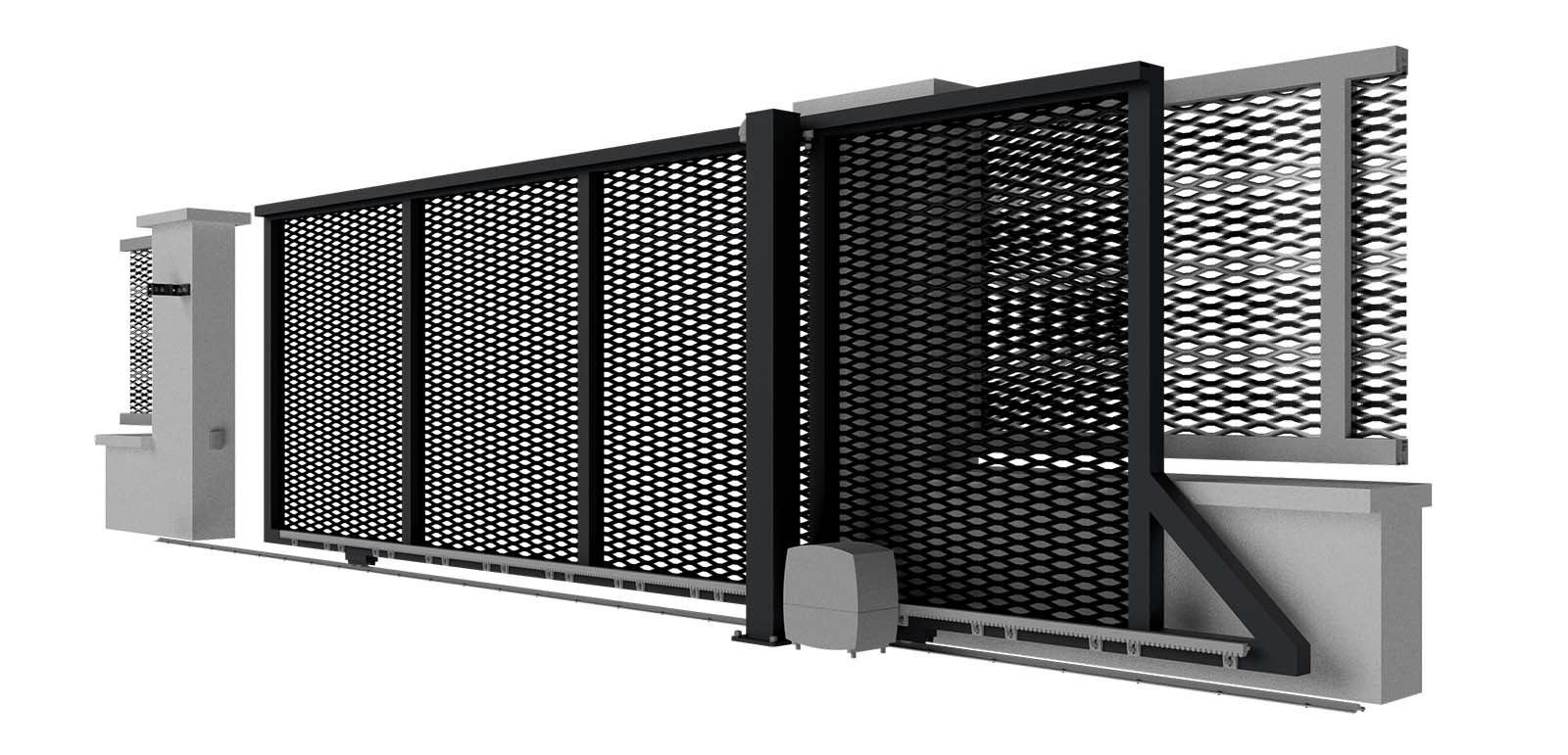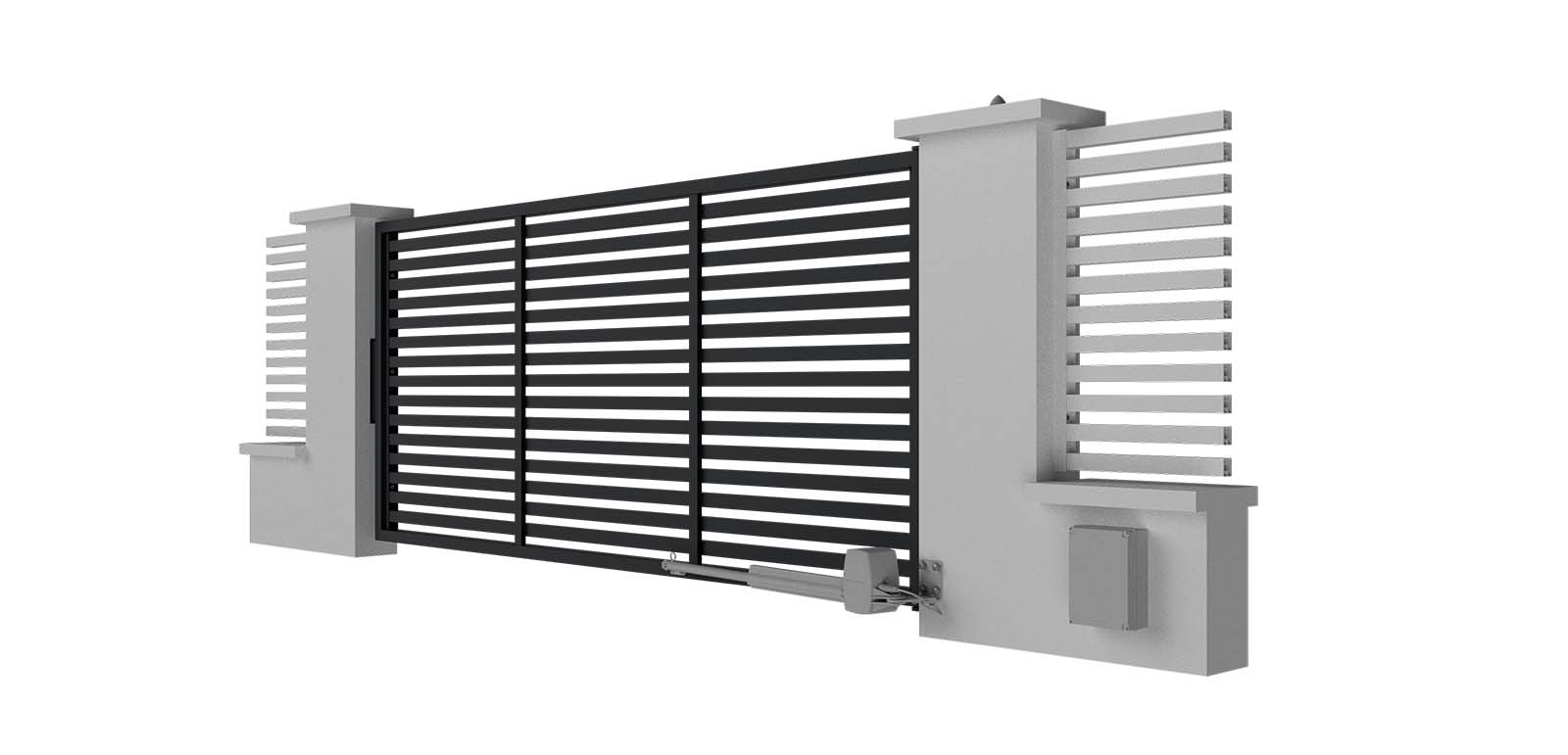 Hliníková samonosná posuvná brána LAMARK | Motiv Lobon | Šedá antracitová barva | Zděné sloupky