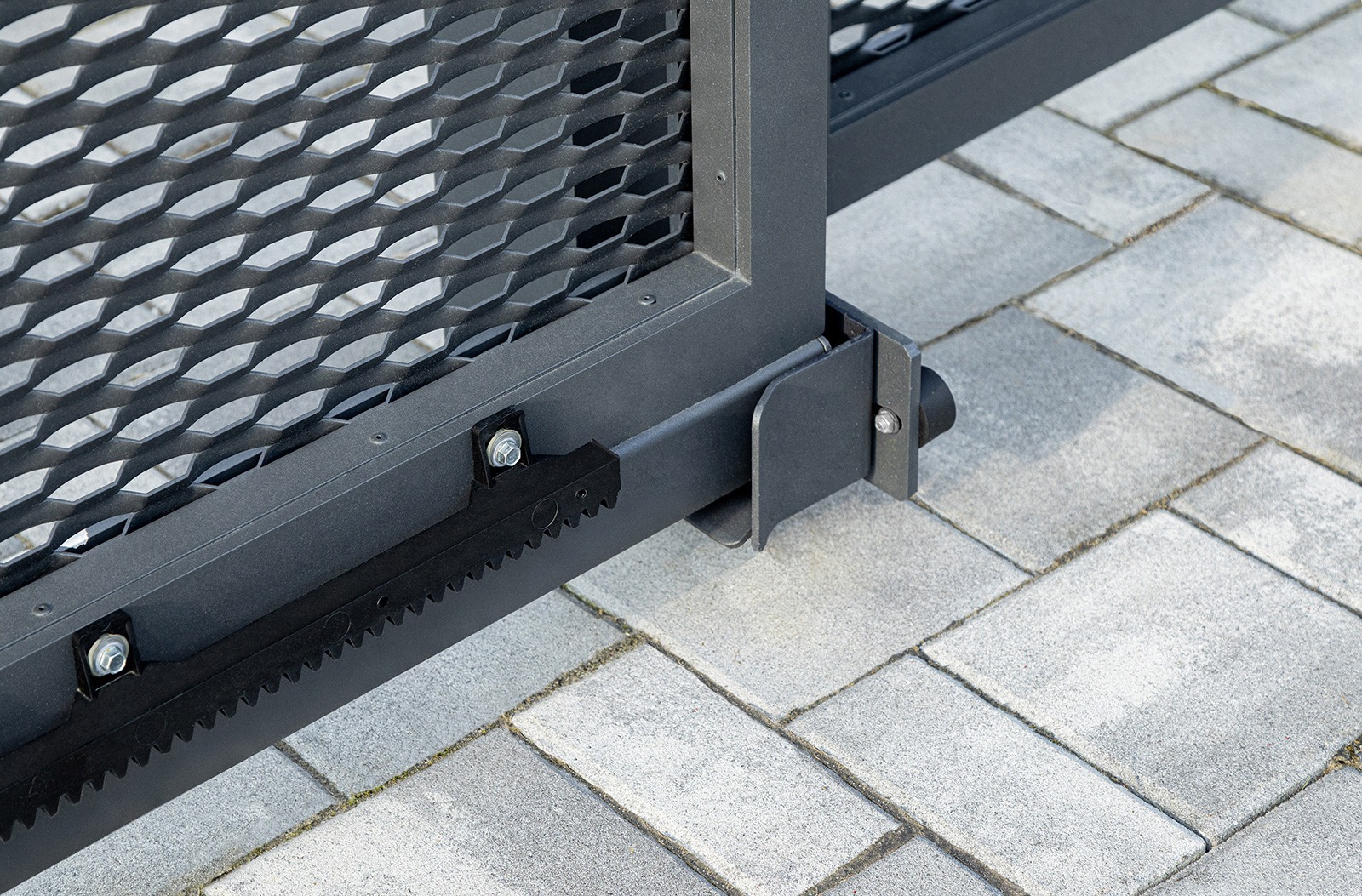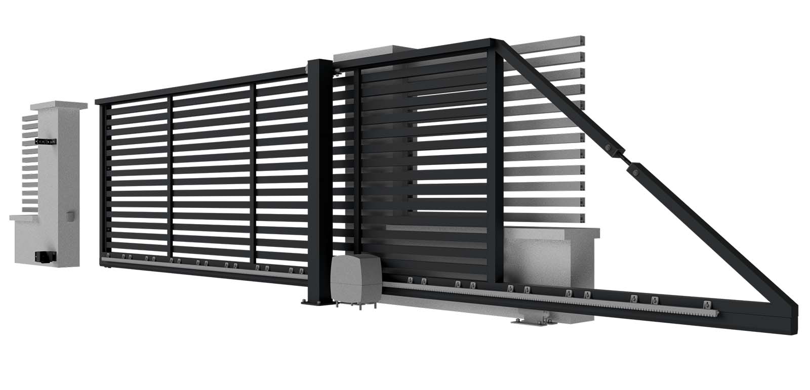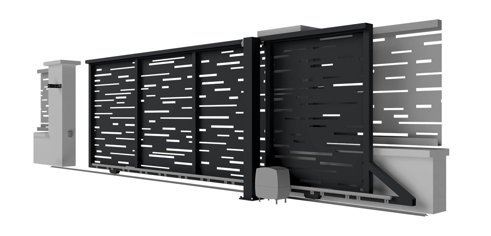 Hliníková samonosná posuvná brána LAMARK | Motiv Lobon | Šedá antracitová barva | Zděné sloupky