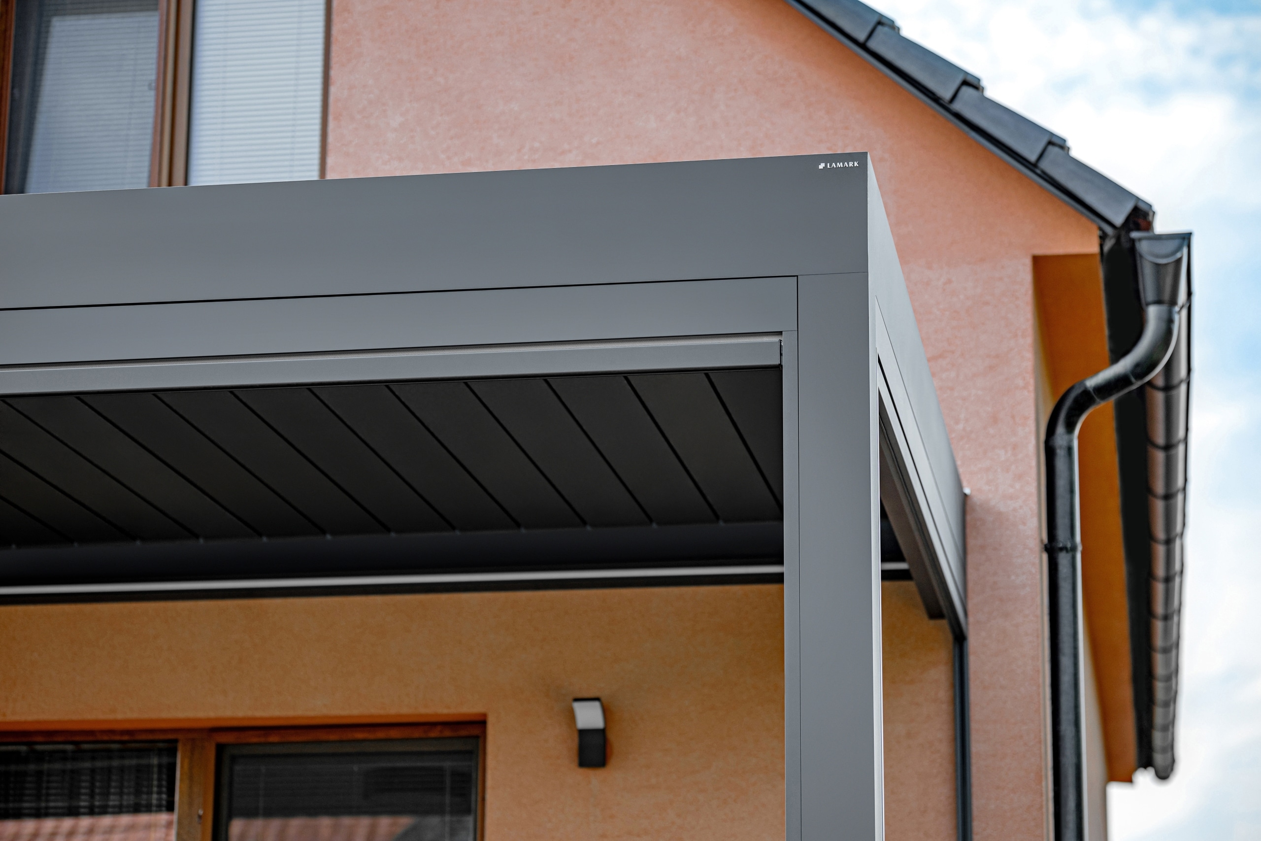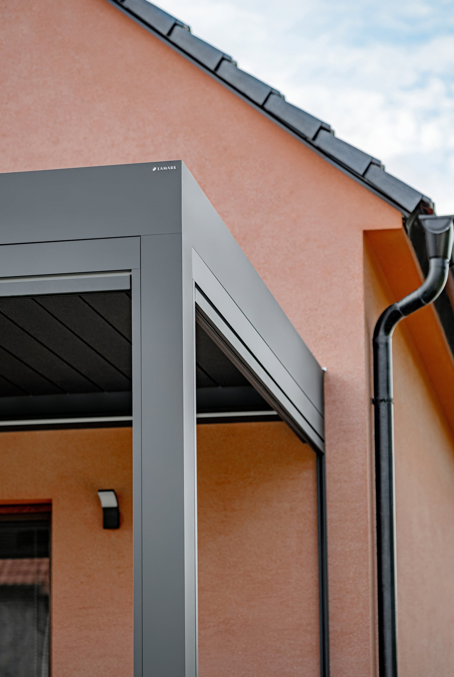 Bioklimatická pergola LAMARK přisazená ke stěně | Čachovice | Boční stínění - screenové rolety | Šedá antracitová barva | Dešťové čidlo | Větrné čidlo | Ovládání
