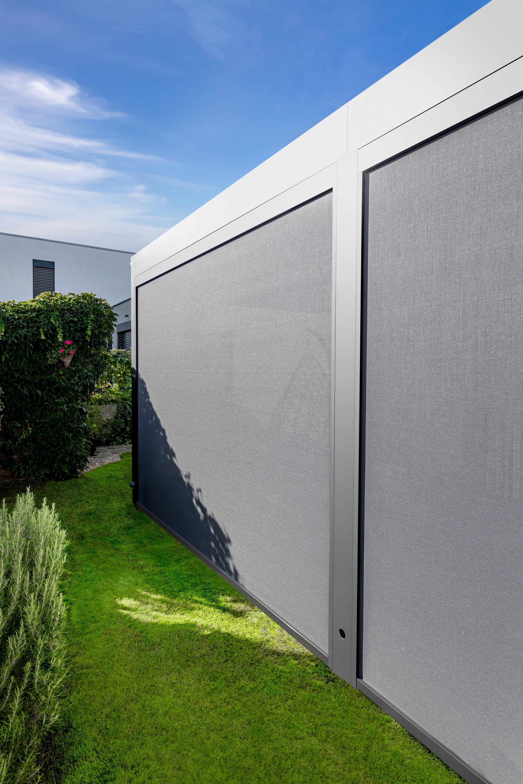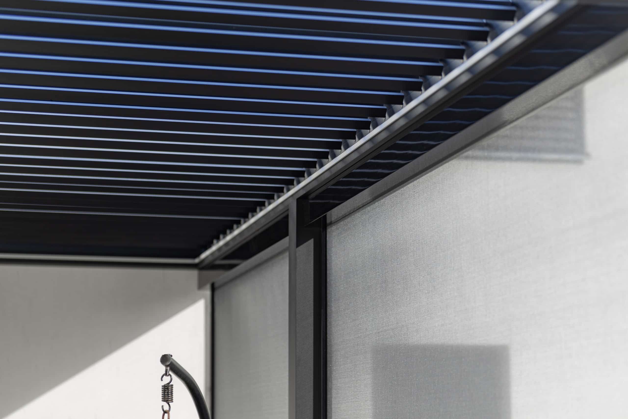 Bioklimatická pergola LAMARK přisazená do rohu | Horní Měcholupy | Boční stínění - screenové rolety | Stříbrná hliníková barva | Dešťové čidlo | Ovládání