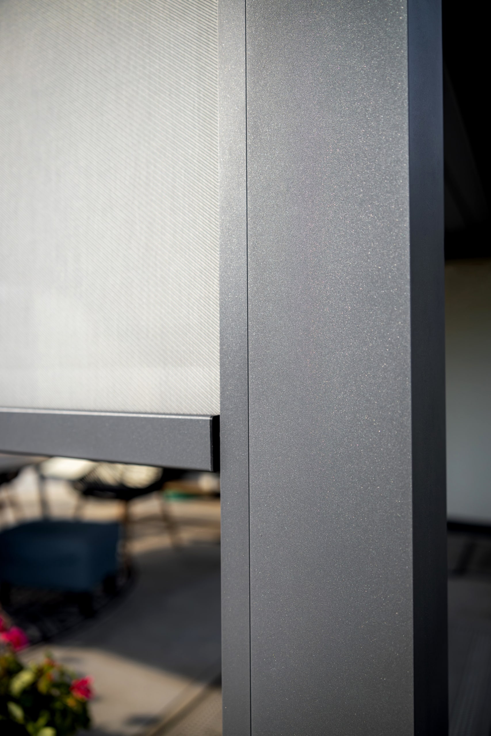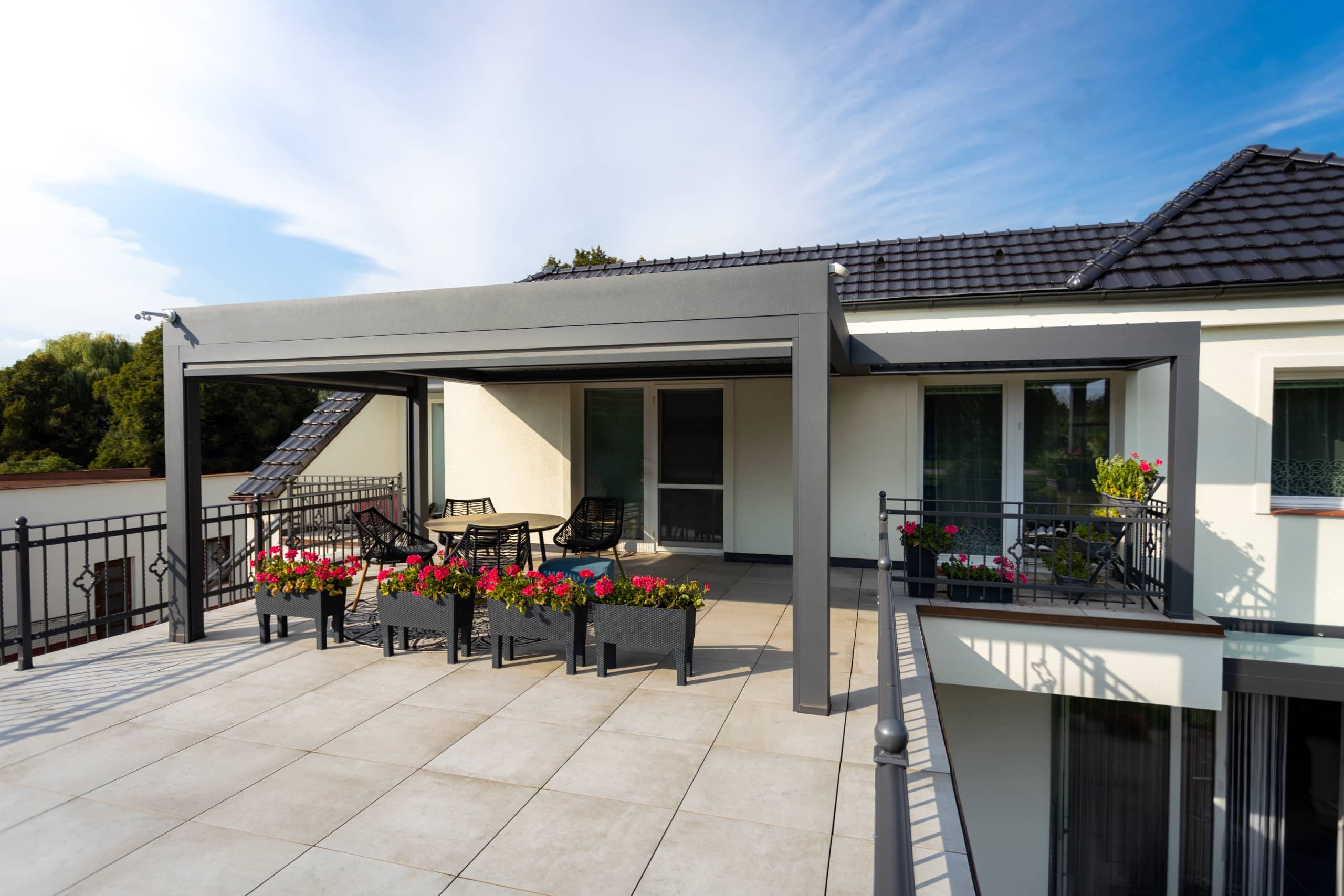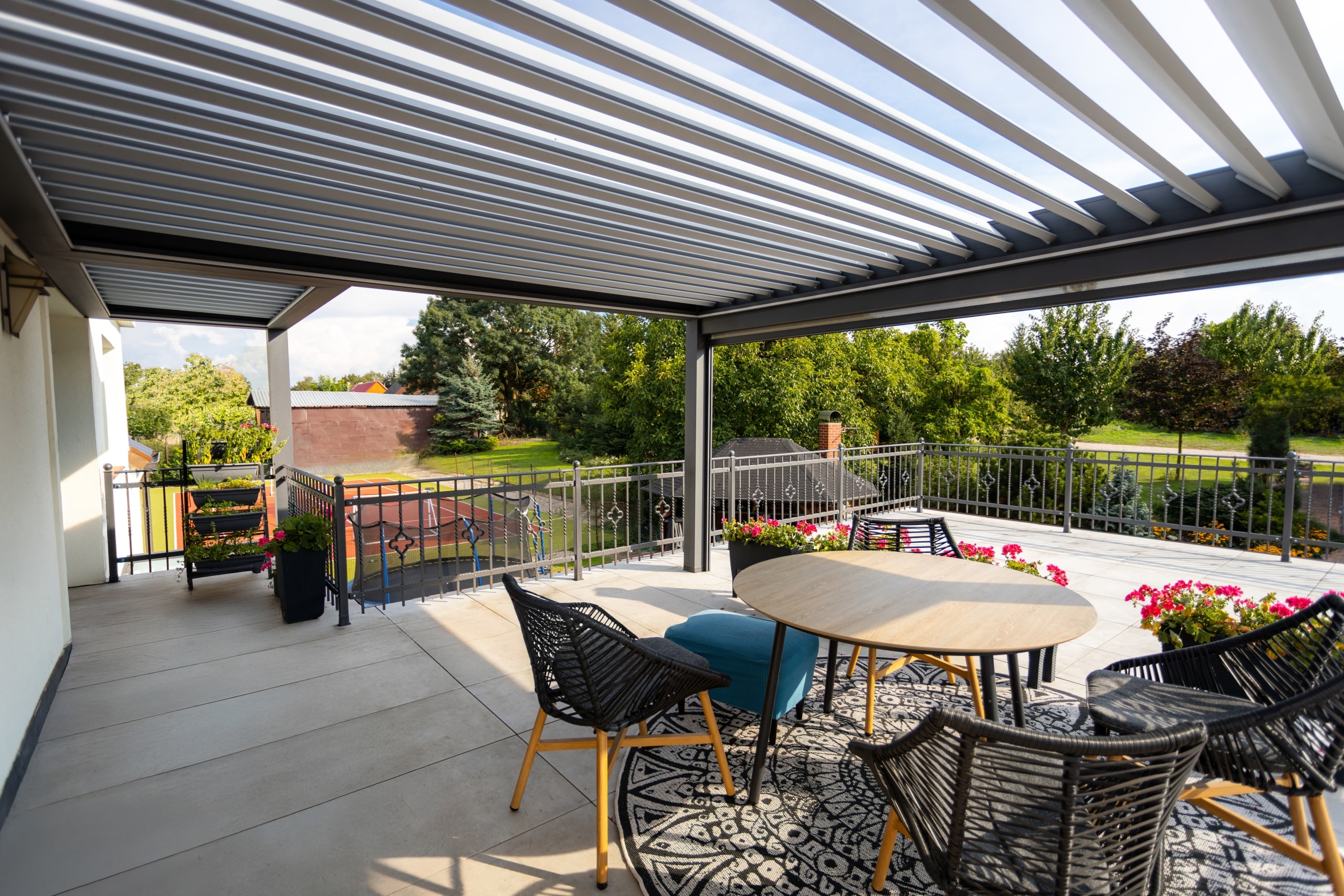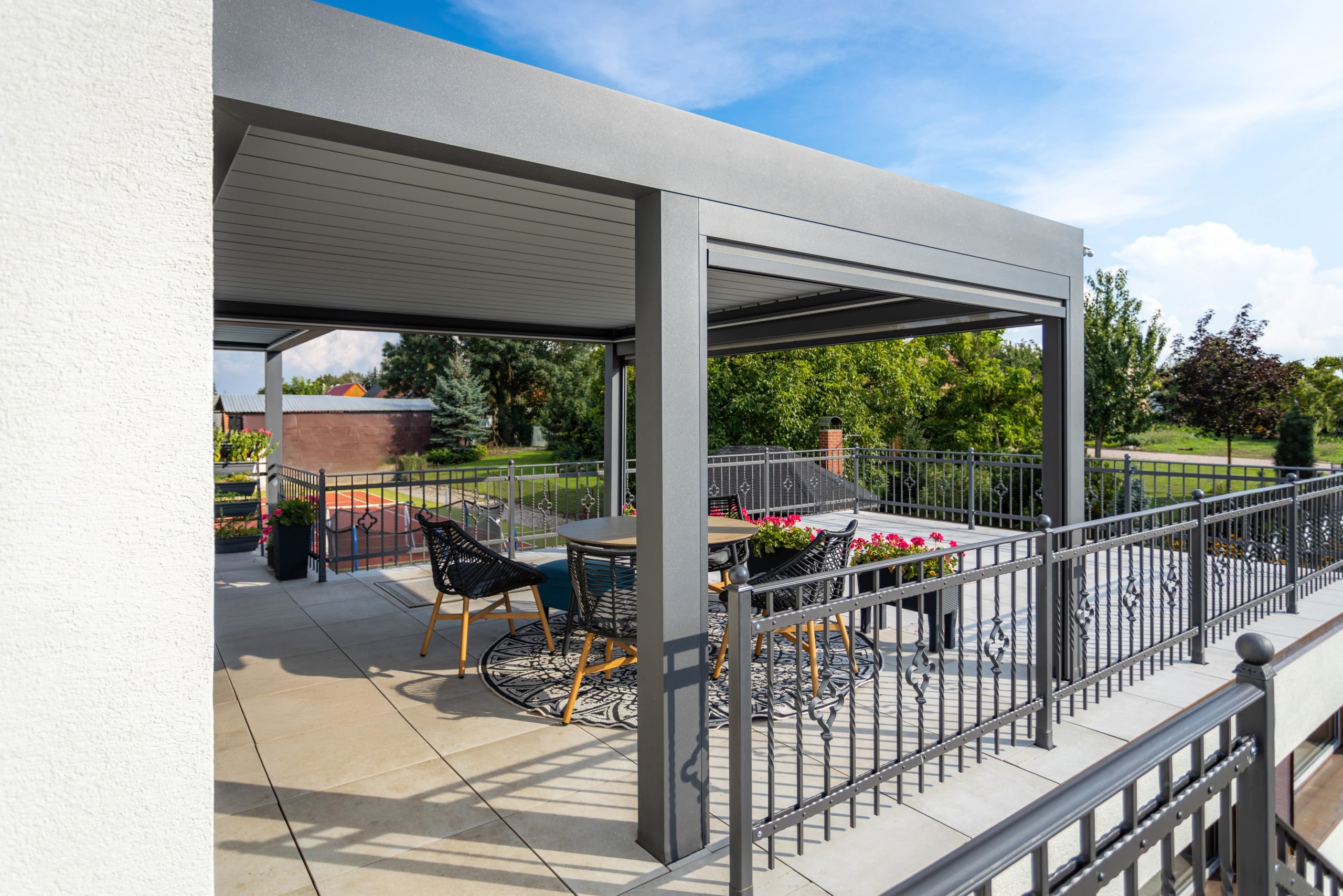 V této realizaci si zákazník zvolil bioklimatickou pergolu přisazenou ke stěně domu, zhotovenou v oblíbené šedé antracitové barvě. Pergola je vybavena screenovými roletami, které poskytují stín a ochranu před větrem. Zvýšený komfort a praktičnost zajišťuje pohon s řídicí jednotkou, dešťové i větrné čidlo a ovládání, což umožňuje automatizovaný provoz a přizpůsobení aktuálním povětrnostním podmínkám. Výsledkem je stylový, funkční a technologicky pokročilý venkovní prostor, ideální pro všestranné využití po celý rok.