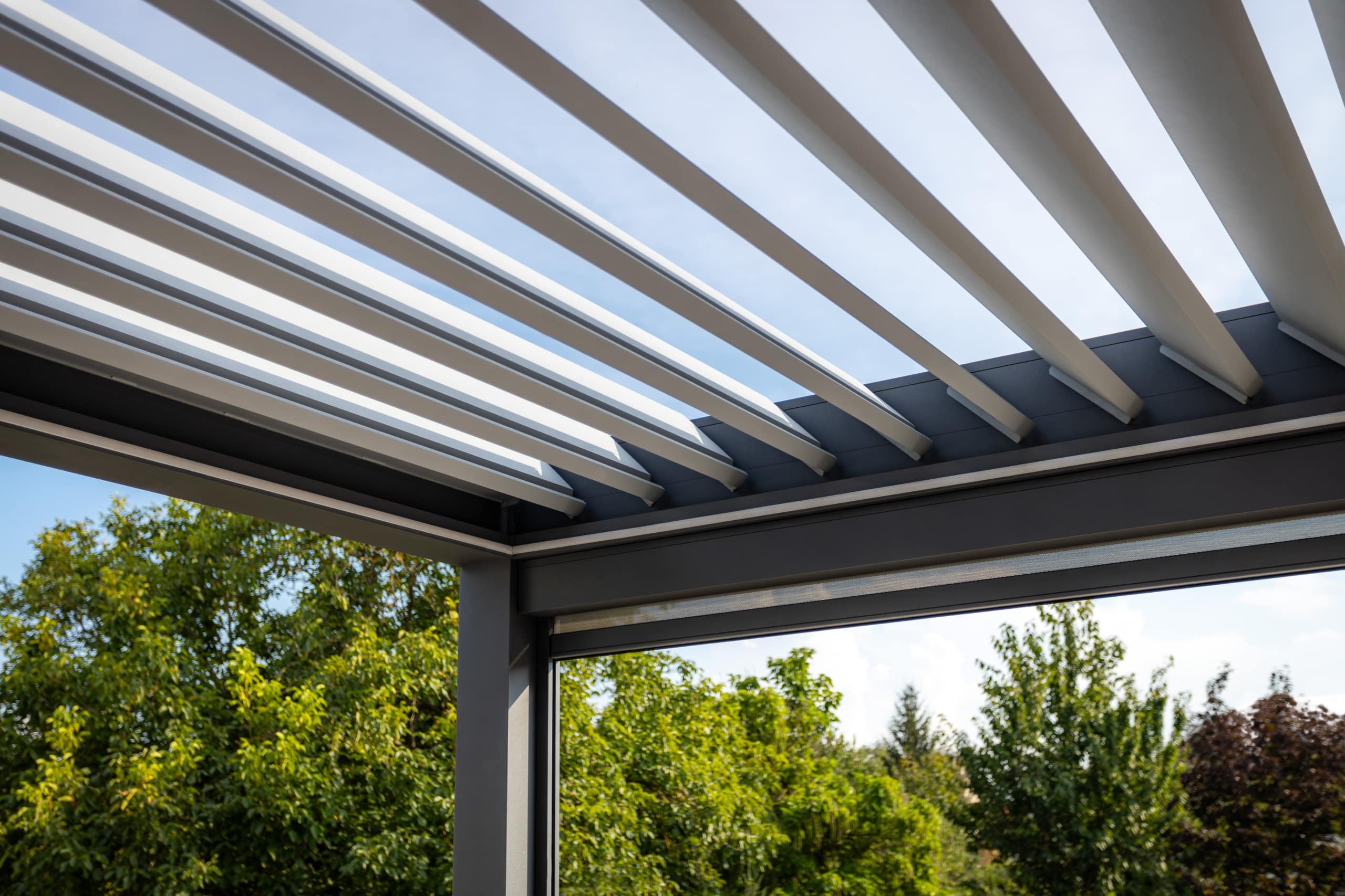 Bioklimatická pergola LAMARK přisazená ke stěně | Nové Město | Boční stínění - screenové rolety | Šedá antracitová barva | Dešťové čidlo | Větrné čidlo | Ovládání