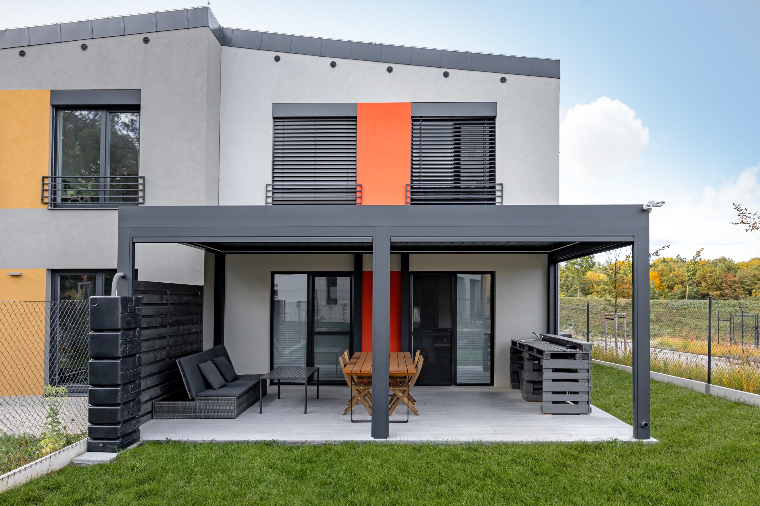 V této realizaci si zákazník zvolil bioklimatickou pergolu přisazenou ke stěně domu, zhotovenou v oblíbené šedé antracitové barvě. Pergola je vybavena screenovými roletami, které poskytují stín a ochranu před větrem. Zvýšený komfort a praktičnost zajišťuje pohon s řídicí jednotkou, dešťové i větrné čidlo a ovládání, což umožňuje automatizovaný provoz a přizpůsobení aktuálním povětrnostním podmínkám. Výsledkem je stylový, funkční a technologicky pokročilý venkovní prostor, ideální pro všestranné využití po celý rok.