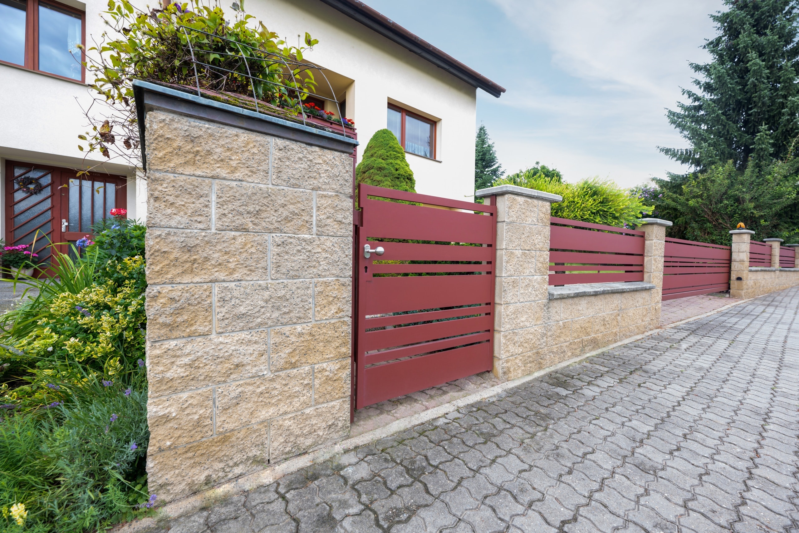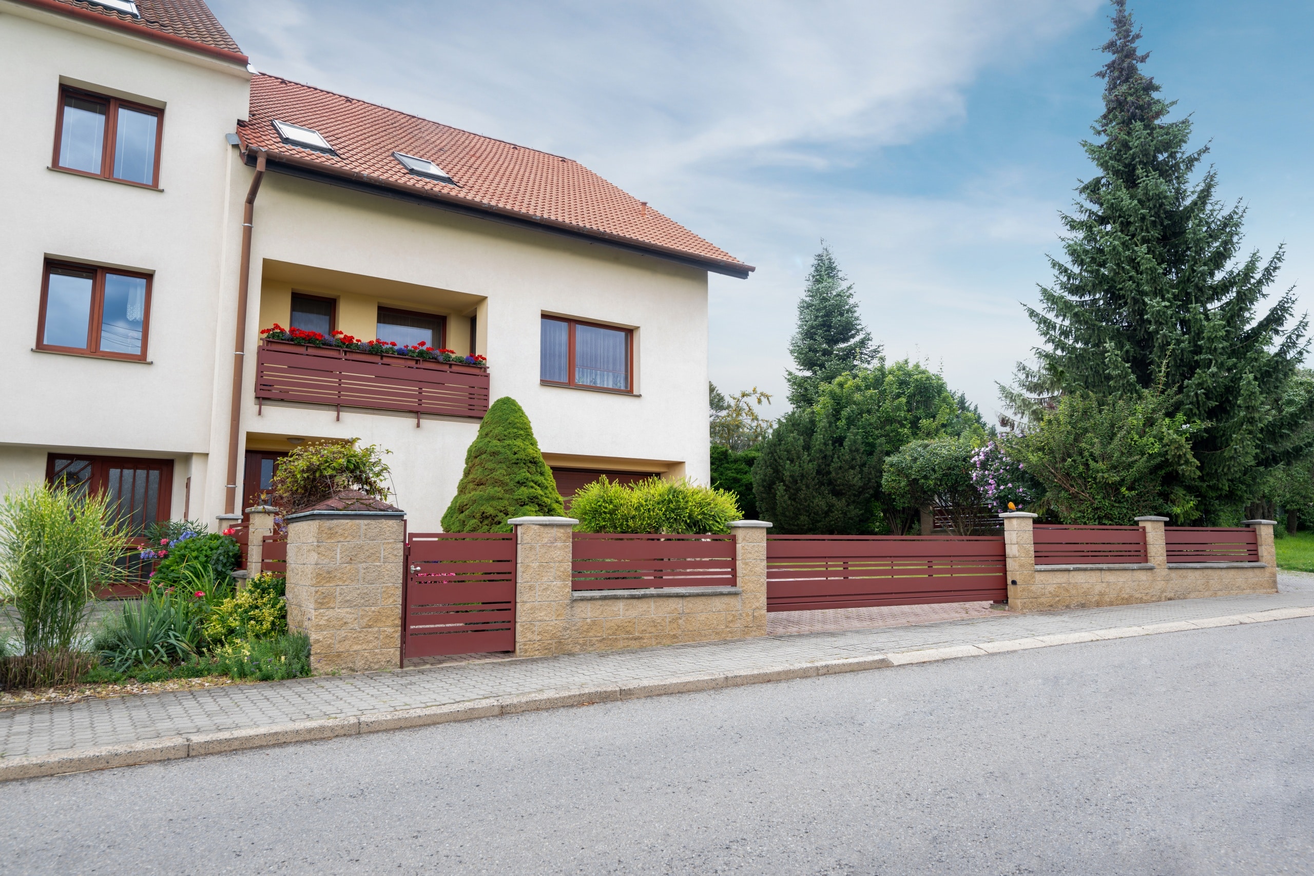 Pro tuto realizaci si zákazník zvolil tahokov plot s motivem Madeira v barvě šedá antracitová. Realizaci tvoří samonosná posuvná brána, jednokřídlá vchodová branka a celkem 12 plotových dílců, které jsme usadili do pevné konstrukce zděných sloupků. Na fotografiích si můžete všimnout, že oplocení nebylo instalováno pouze na rovině, ale i ve svahu – i s tímto technickým řešením jsme si poradili tak, aby výsledný vzhled působil čistě a vyváženě.