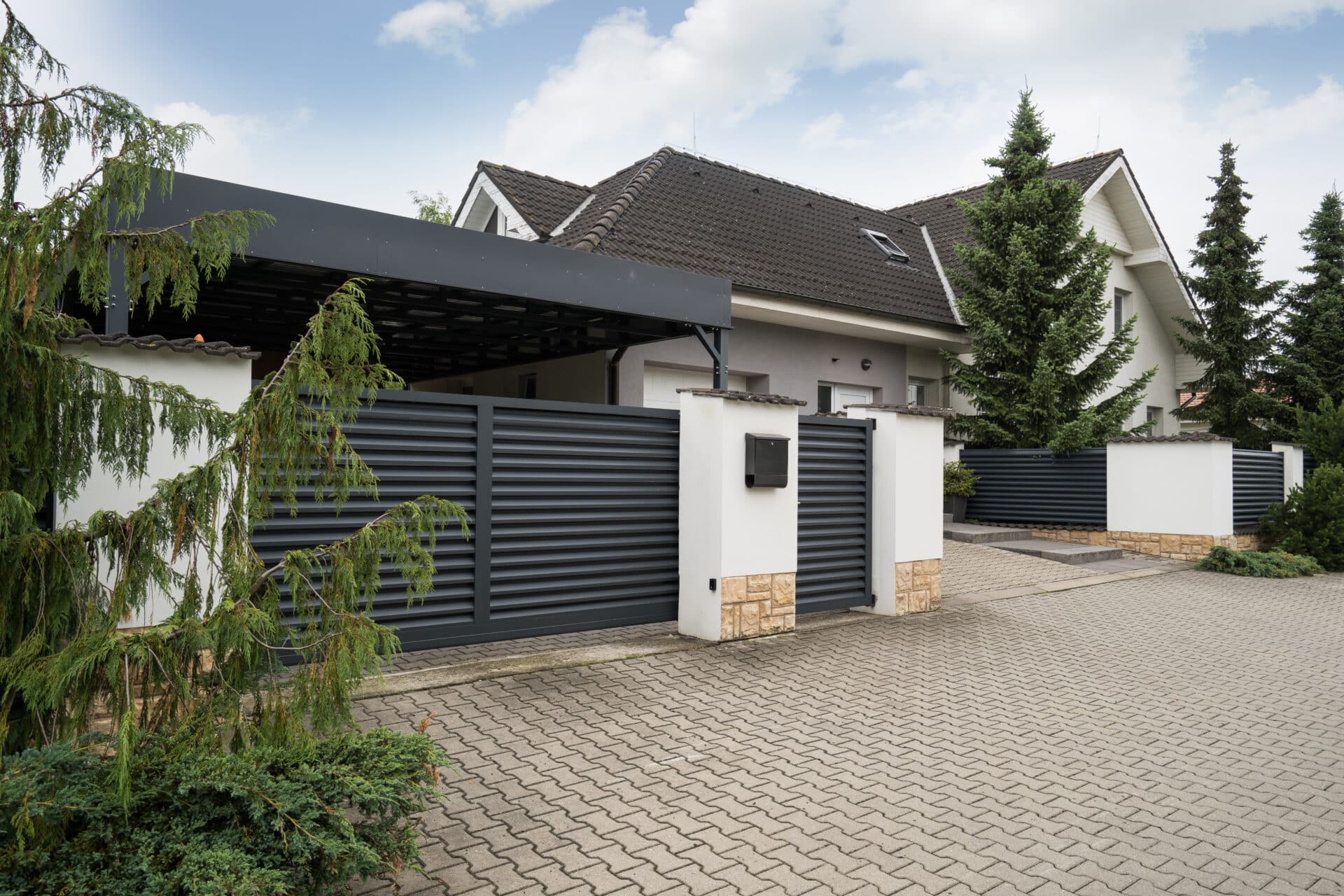 Zákazník si pro tuto realizaci vybral hliníkový plot s motivem Lugo, který v šedé antracitové barvě působí moderně a elegantně. Oplocení zahrnuje šest plotových dílců upevněných mezi zákazníkem připravené zděné sloupky. Součástí realizace je také samonosná posuvná brána pro pohodlný vjezd a jednokřídlá vchodová branka, která nabízí snadný přístup.