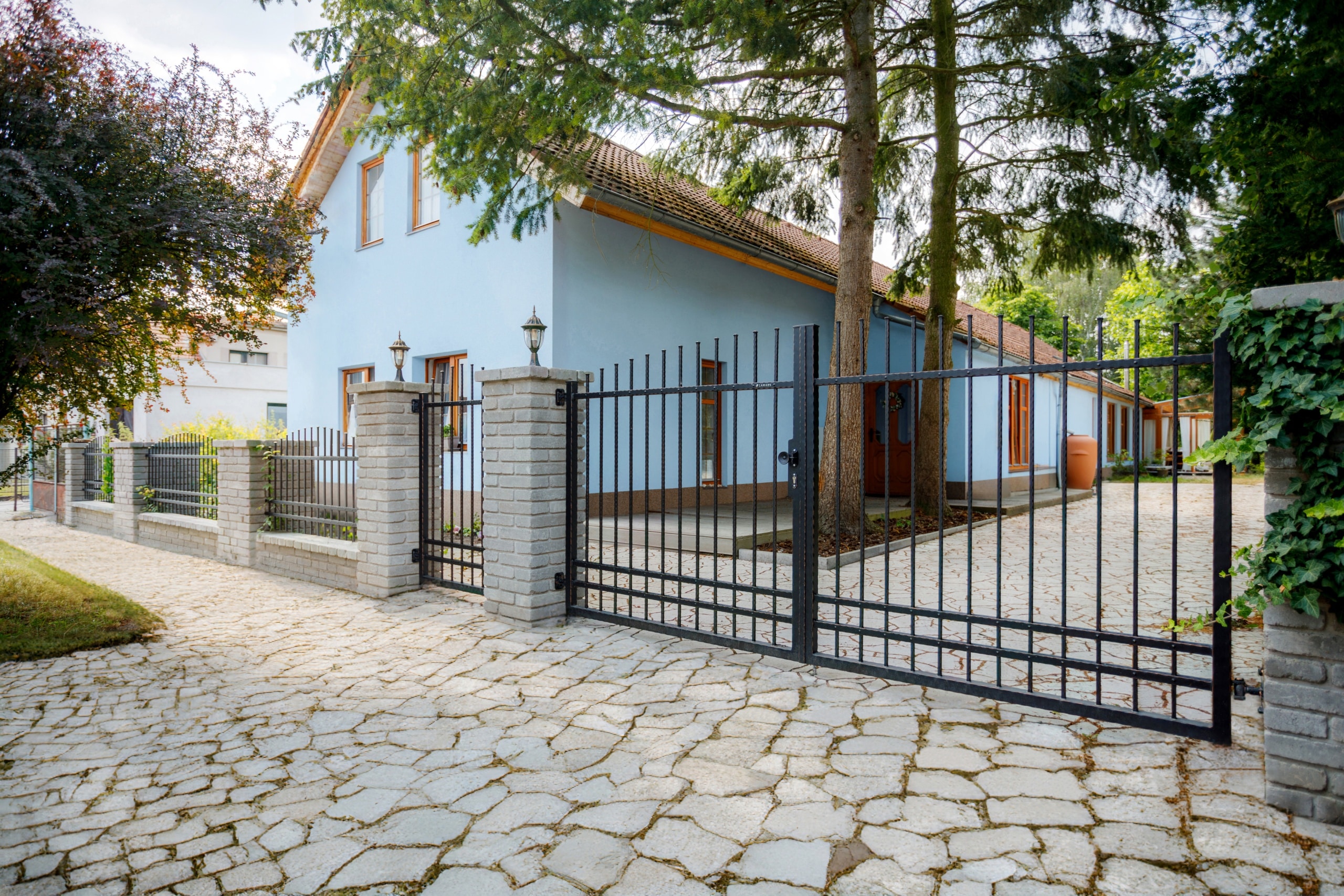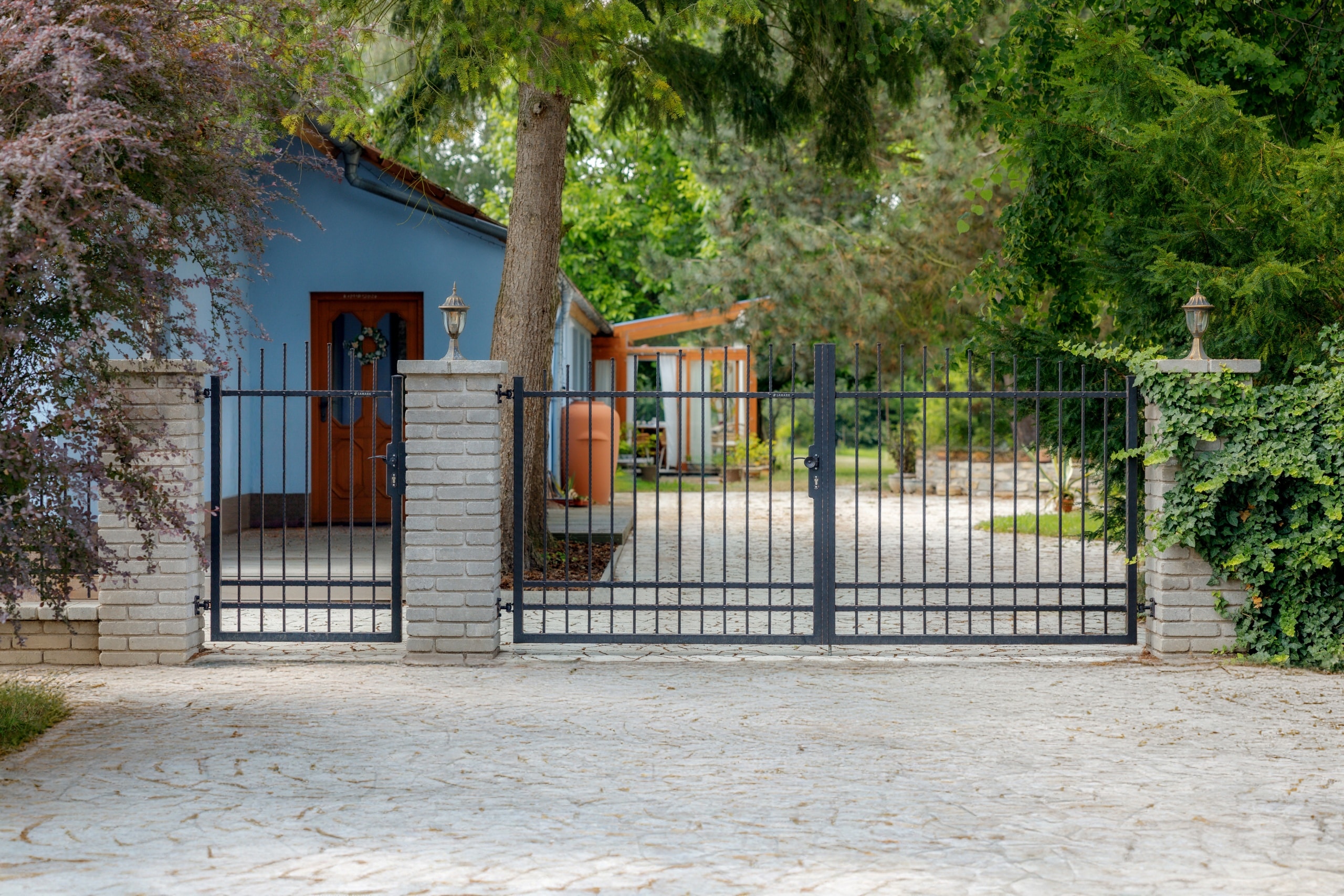 Pro tuto realizaci zákazník zvolil kovaný plot s motivem Detroit, v černé kovářské barvě s měděnou patinou. Oplocení tvoří pět plotových dílců, otočná dvoukřídlá brána s ručním otevíráním a jednokřídlá branka, vše pečlivě usazené mezi zděné sloupky. Plot jsme vyrobili v oklepávaném provedení s okovanými konci a nýty, což podtrhuje jeho tradiční vzhled.
