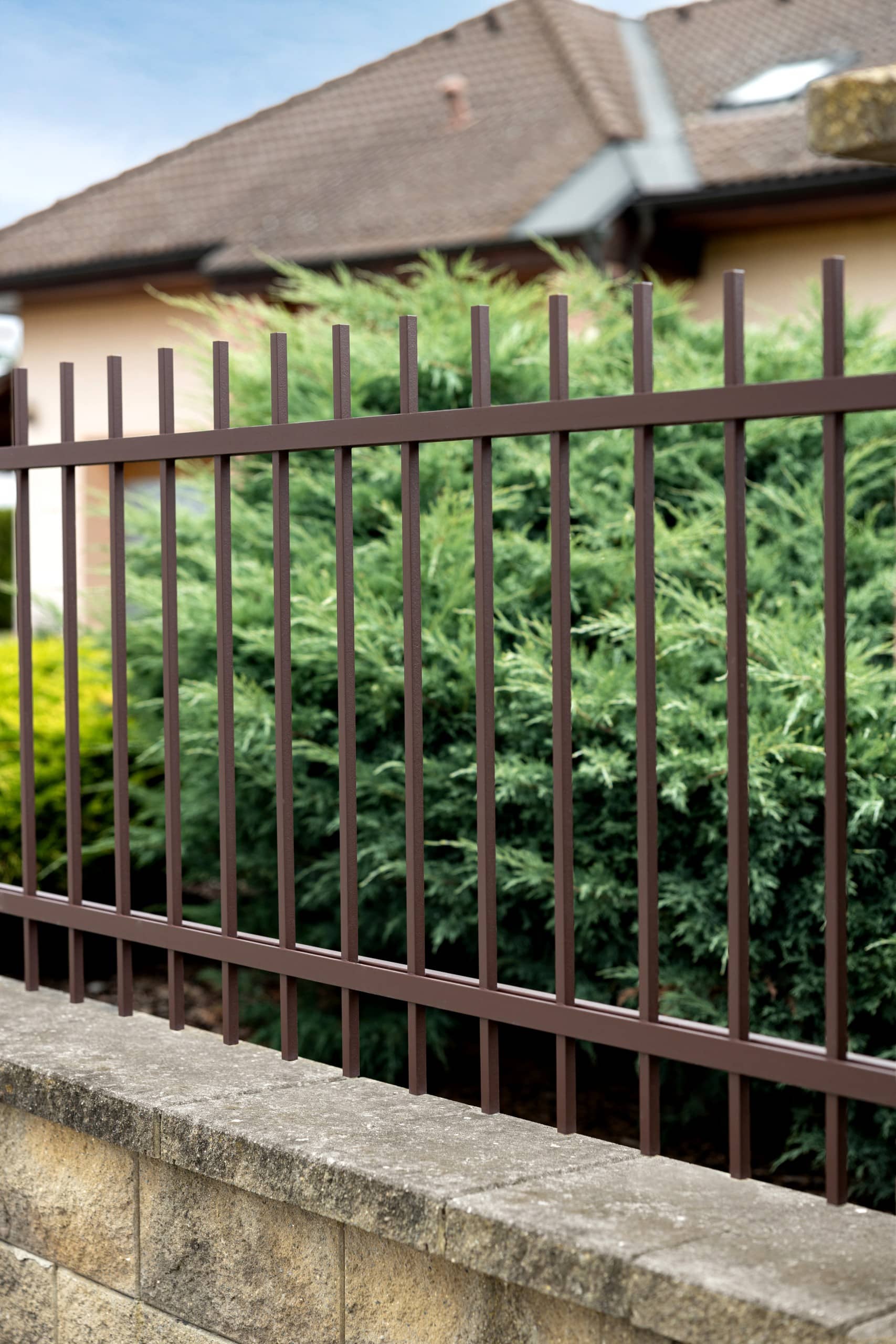 Kovaný plot LAMARK | Motiv Portoriko | Hladké provedení | Bez nýtů | Rovné zakončení | Hnědá čokoládová barva | Zděné sloupky