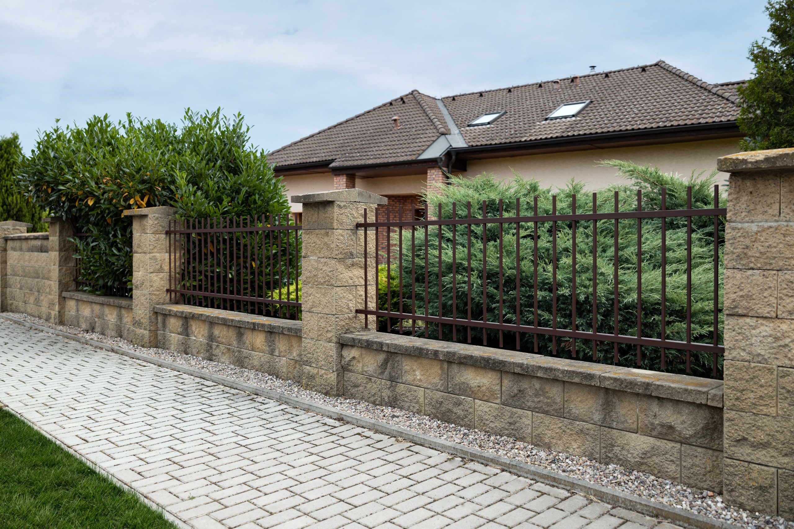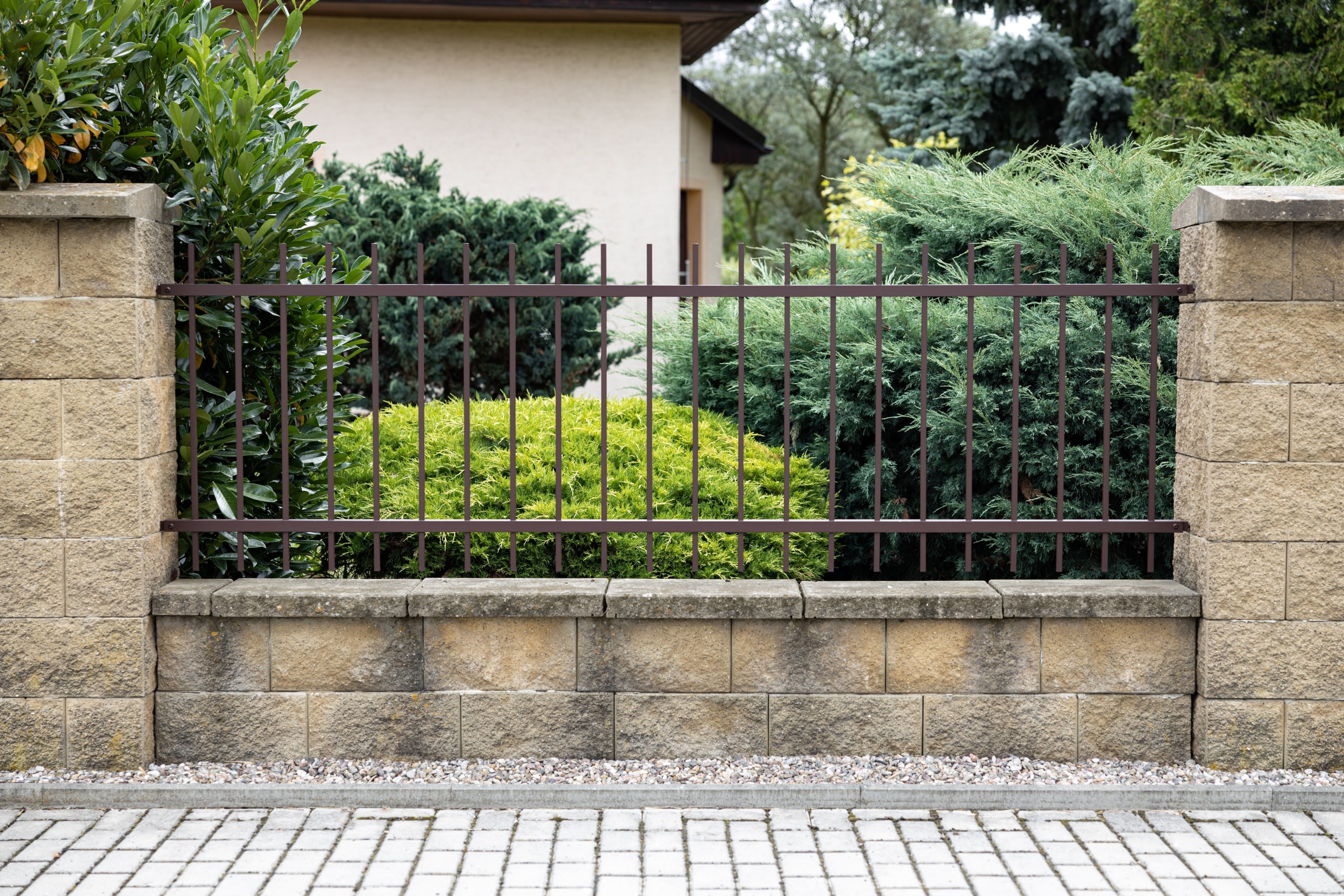 Pro tuto realizaci si zákazník vybral kovaný plot s motivem Portoriko v hnědé čokoládové barvě bez patiny. Oplocení se skládá z pěti plotových dílců, které jsme precizně usadili mezi zděné sloupky připravené zákazníkem. Dále jsme instalovali samonosnou posuvnou bránu a jednokřídlou vchodovou branku, jejichž design plynule navazuje na vzhled plotových dílců. Celý plot je v hladkém provedení s rovným zakončením a je svařovaný bez nýtů.
