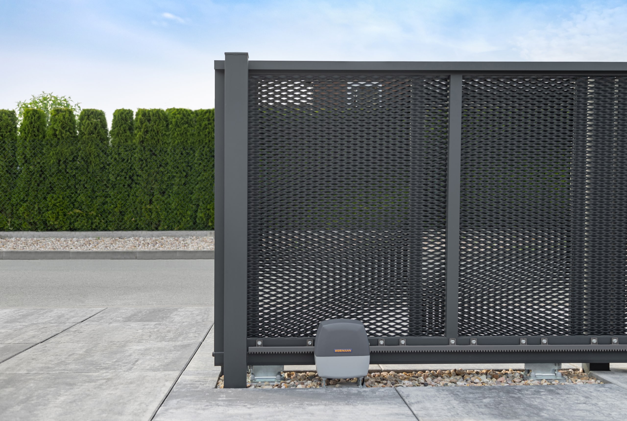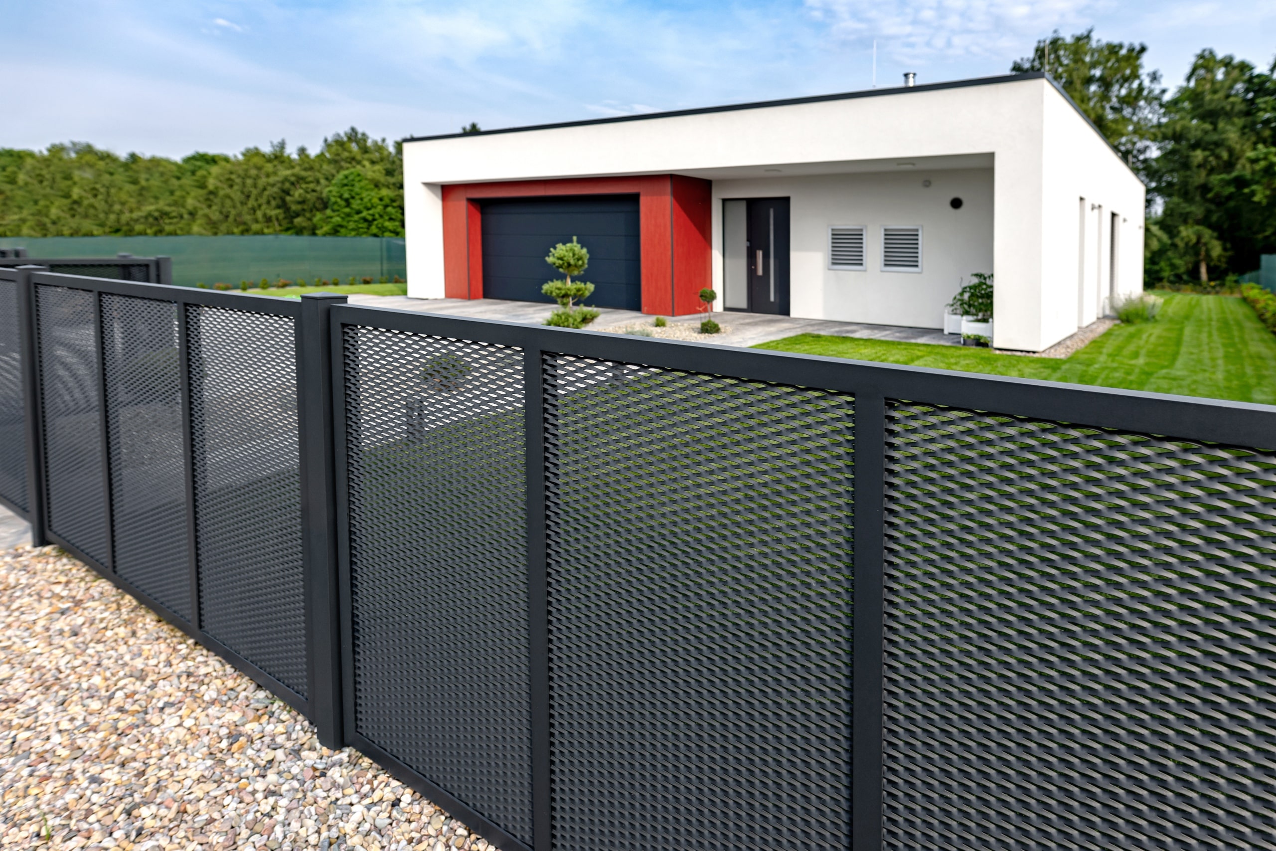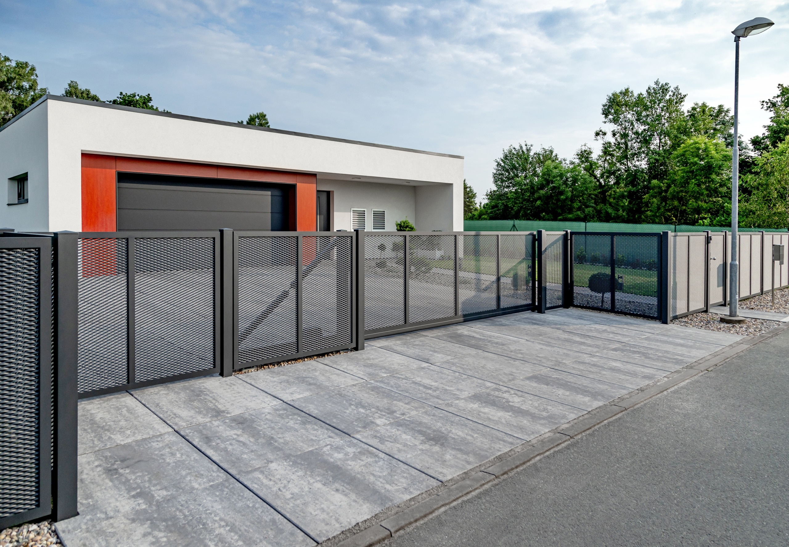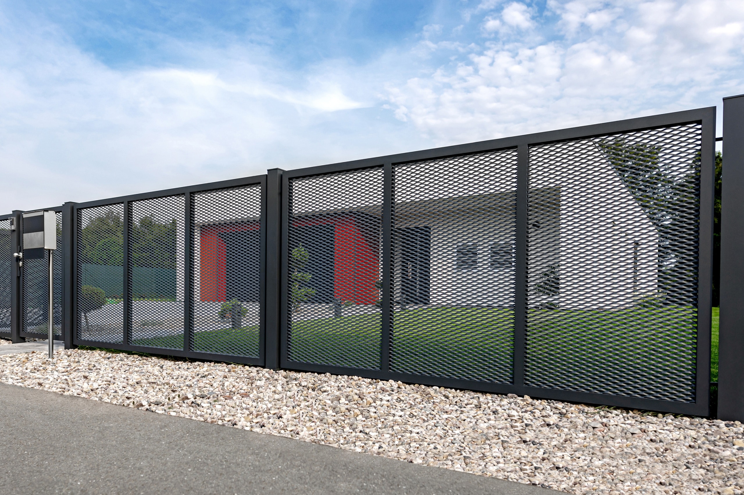V této realizaci si zákazník vybral tahokov oplocení s motivem Madeira v elegantní černé kovářské barvě. Na fotografiích si můžete všimnout, že zákazník si k pěti plotovým dílcům netradičně zvolil dvě samonosné posuvné brány a tři jednokřídlé vchodové branky, které ladí s celkovým designem oplocení. Pro zvýšení funkčnosti jsme na přání zákazníka integrovali praktický poštovní modul, čímž bylo dosaženo elegantního a plně funkčního výsledku.