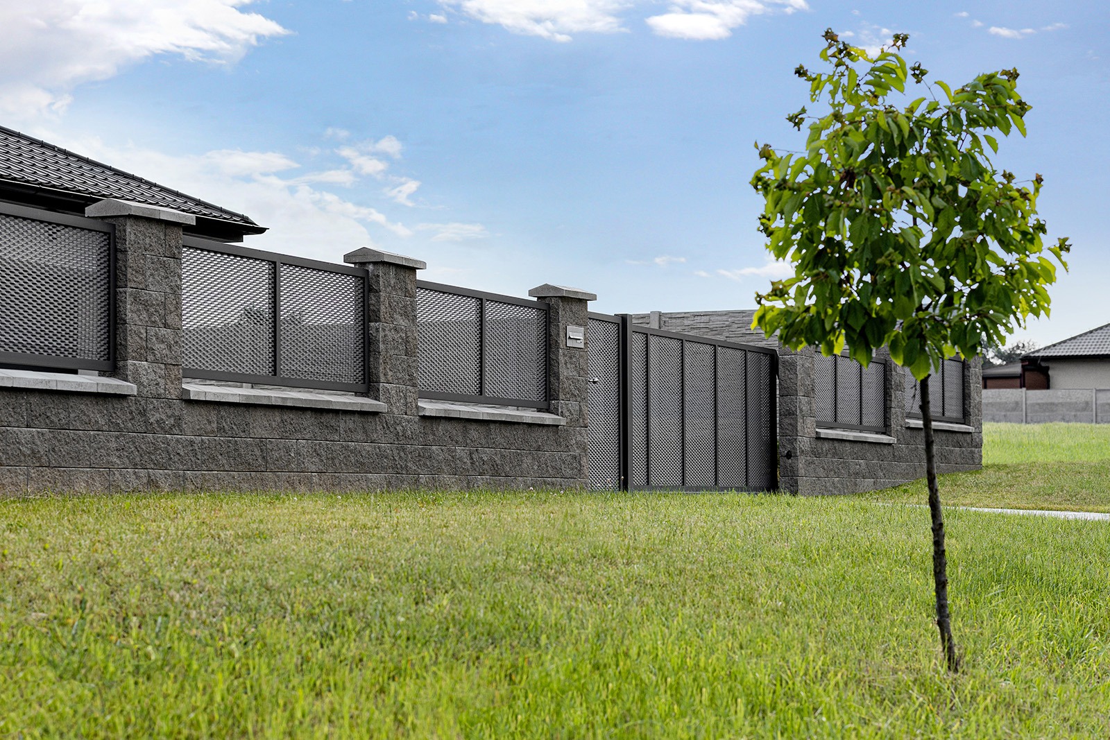 Pro tuto realizaci si zákazník zvolil tahokov plot s motivem Madeira v barvě šedá antracitová. Realizaci tvoří samonosná posuvná brána, jednokřídlá vchodová branka a celkem 12 plotových dílců, které jsme usadili do pevné konstrukce zděných sloupků. Na fotografiích si můžete všimnout, že oplocení nebylo instalováno pouze na rovině, ale i ve svahu – i s tímto technickým řešením jsme si poradili tak, aby výsledný vzhled působil čistě a vyváženě.