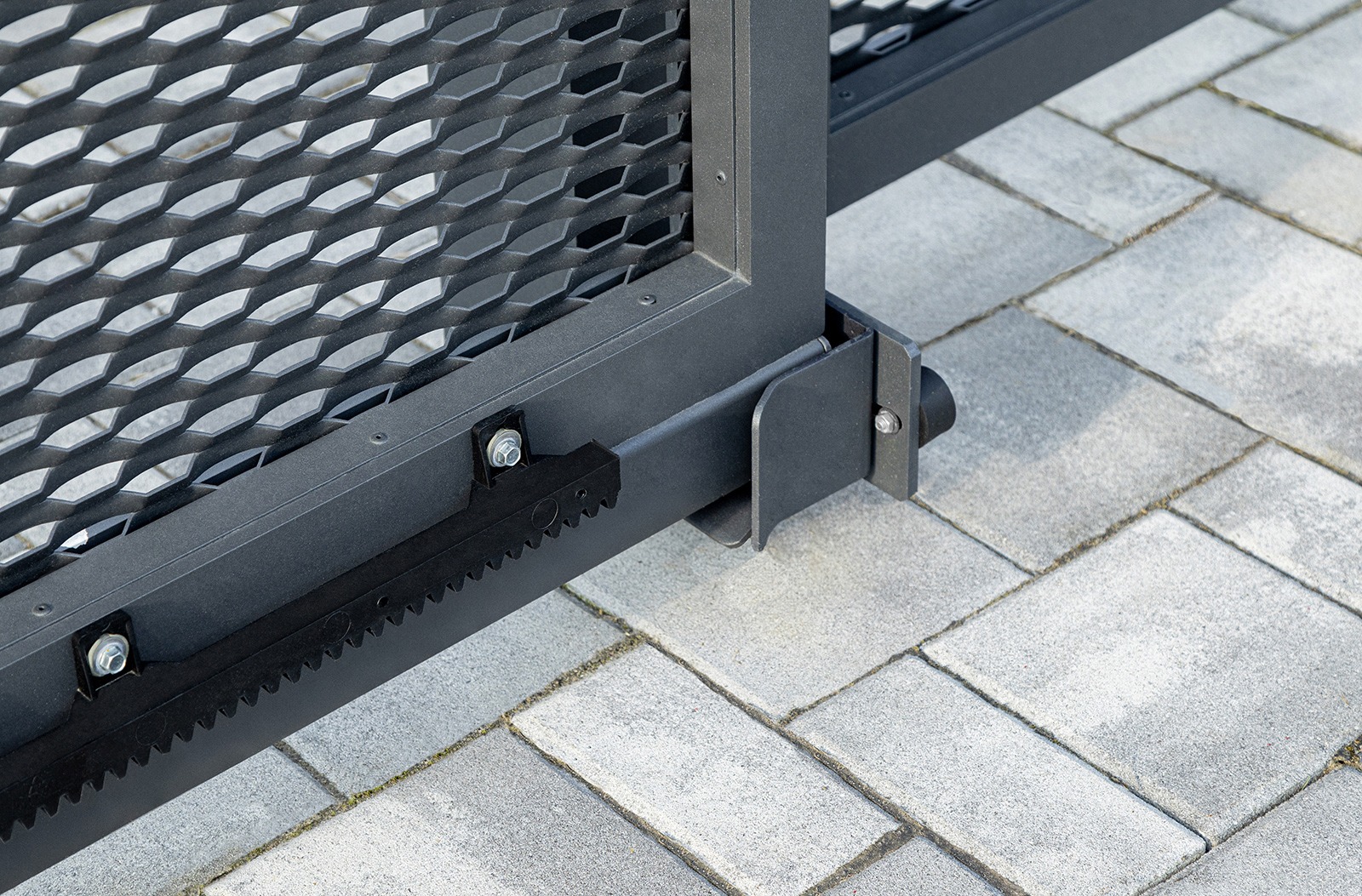 Samonosná posuvná brána a jednokřídlá branka LAMARK z tahokovu | Motiv Madeira | Šedá antracitová barva | Zděné sloupky